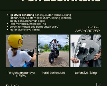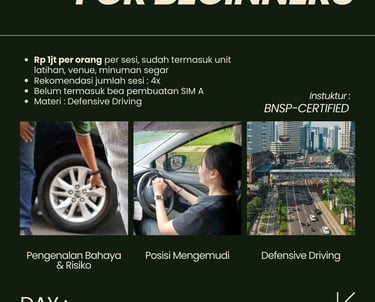 Ditujukan untuk para pemula yang ingin mempelajari mengemudikan kendaraan (motor dan mobil) dari nol dengan cara yang baik, benar dan aman ala Defensive Driving dan Riding. Menggunakan lahan tertutup tanpa ada gesekan dengan pengguna jalan lain serta diberikan alat pelindung diri saat berlatih seperti helm, sarung tangan dan protektor siku serta lutut. Dengan rekomendasi pertemuan 3x agar Trainer dapat melihat progress peserta terhadap pelatihan yang dijalani. Harga pelatihan mulai dari Rp 500.000,- per pertemuan.